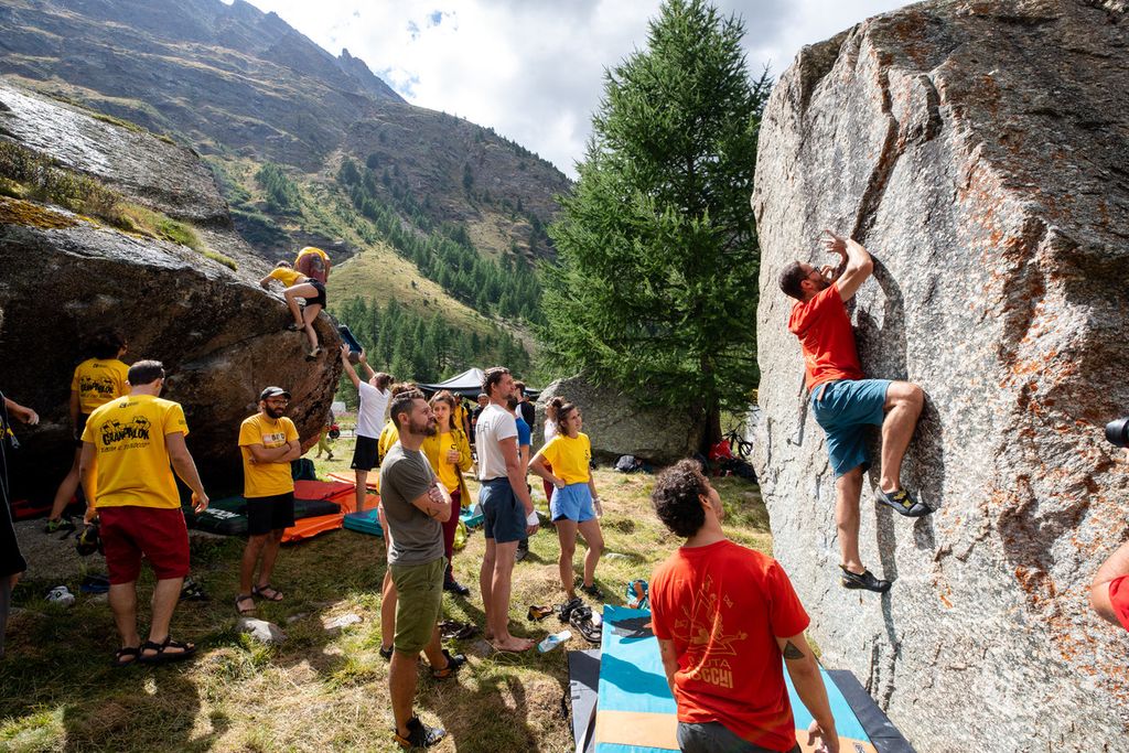 Grande successo per il primo dei due appuntamenti della quarta edizione di GRANPABLOK. La piana di Le Pont in Valsavarenche si è dunque colorata nuovamente di giallo, la t-shirt degli oltre 220 iscritti provenienti quasi tutti da fuori Valle. La collaudata e sempre più apprezzata formula del raduno 'LIBERA IL TUO BLOCCO' ha offerto ai partecipanti la possibilità, unica nel contesto degli eventi boulder, di scovare, scegliere, tracciare e liberare le proprie linee sui numerosi sassi.