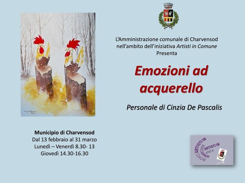 E' allestita dal 13 febbraio al 31 marzo nel Municipio di Charvensod, nell’ambito dell’iniziativa 'Artisti in Comune', l'esposizione della pittrice Cinzia De Pascalis dal titolo 'Emozioni ad acquerello.