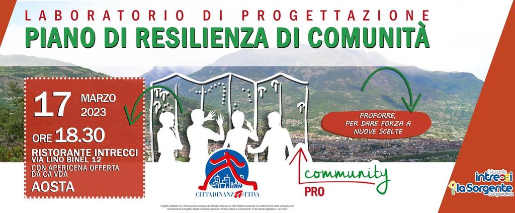 E' organizzato per venerdì 17 marzo alle ore 18,30 ad Aosta, al Ristorante Intrecci in via Binel 1 ad Aosta, il terzo Laboratorio 'Community pro' del Piano di resilienza di Comunità di Cittadinanzattiva VdA.