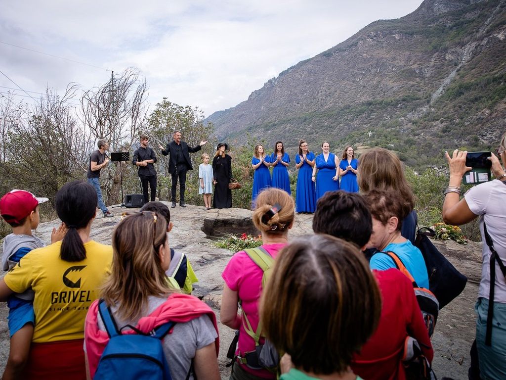 L’attrice Alexine Dayné e l’attore Andrea Damarco hanno interpretato i quattro luoghi attraverso le leggende, le emozioni e le storie che li rappresentano. E’ stato Renato Mannoni, cavatore di professione, a ispirare la performance ai marmi di Châtillon, mentre il Bosco di Lavesé si è popolato di letture da 'Le Metamorfosi' di Ovidio con l’accompagnamento del flauto di Francine Barailler; a Pontey, le voci femminili del coro 'La Dominante' hanno scandito i passi verso la tomba scavata nella roccia; protagonisti infine nel Parco del Gamba l’amore e la poesia, sostenuti dalla musica di Sergio Pugnalin.