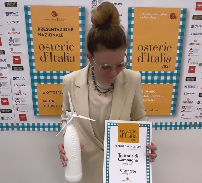 Prestigioso e meritato riconoscimento per la Trattoria di Campagna, storico ristorante valdostano lungo la Statale 26 a Sarre, aperto nel 1976 e tuttora gestito dalla famiglia Cortese. La selezione curata dalla sommelier di famiglia, Beatrice Cortese ha ottenuto dalla 'Guida osterie d'Italia 2024' di Slow Food il premio speciale 'Miglior Carta dei Vini' per “una carta ampia, variegata e coerente, in cui il territorio è messo in mostra con doverosa attenzione, e il resto d'Italia viene raccontato in profondità e senza scorciatoie, alla ricerca del meglio". Il riconoscimento è stato consegnato a Beatrice Corese dalla Responsabile Marketing Elena Tassone di Acqua S. Bernardo.