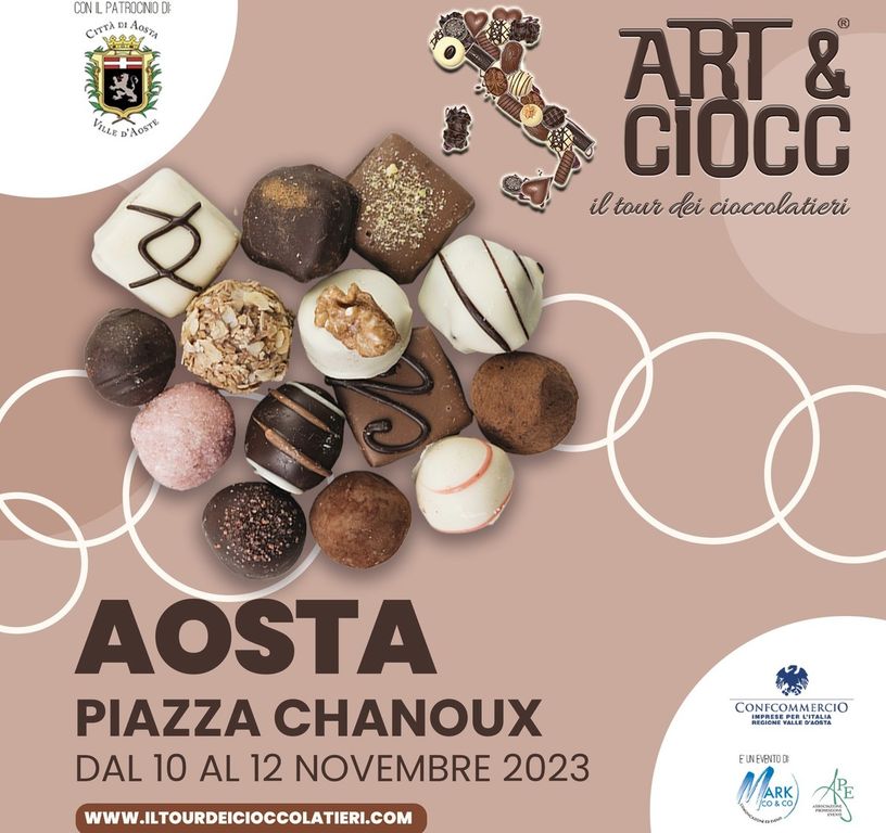 Da venerdì 10 a domenica 12 novembre si rinnova ad Aosta l’ormai tradizionale appuntamento con il Tour dei Cioccolatieri di “ART & CIOCC”, circuito che raduna alcuni dei più importanti maestri artigiani del cioccolato, che inonderanno di dolcezza piazza Chanoux con numerosi stand con cioccolato per tutti i gusti e in tutte le forme.