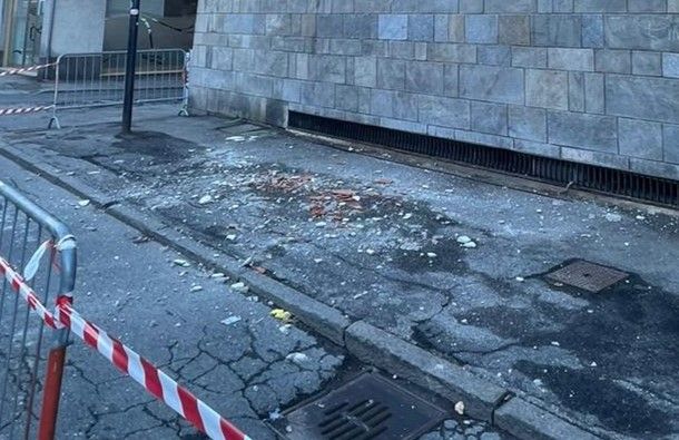 Questa mattina martedì 7 novembre, verso le 8, una porzione del coronamento intonacato del mercato coperto Les Halles di Aosta si è staccata finendo sul marciapiede al lato ingresso principale, dove fortunatamente, nonostante fosse giorno di mercato, non stava passando nessuno.