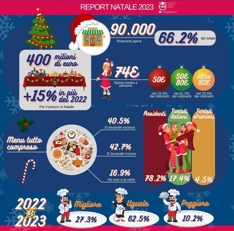 Cinque milioni e 400 mila italiani consumeranno il pranzo di Natale fuori casa, ma non mancano anche i turisti stranieri che sceglieranno di festeggiare il Natale in uno dei 90.000 ristoranti del Paese aperti il 25 dicembre. Rispetto al 2022 il dato è in crescita del 10,2%. Stesso trend per le attività che hanno deciso di rimanere aperte, passate dal 65,2 del 2022 al 66,2 del 2023.