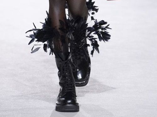 Con tasca appositamente creata per inserire la mano, complice di un portamento disinvolto, è la versione diValentino. La sua minigonna ha fiocchetti nel lato opposto ed è abbinata a una camicia oversize per un looktotal red. Ai mocassini, Valentino preferisce anfibi neri lucidi a 8 buchi con pennacchi, inserti chic perpermettere alla donna di “volare”.