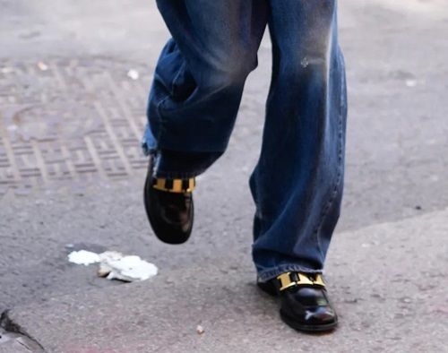 Per chi non vuole portare calzini o non vuole mostrarli, jeans baggy sono la soluzione giusta. Denim pants dal cavallo basso e ampi sui fianchi cadono sui classici mocassini neri, mettendo in risalto la preziosa fibbia che riprende l’oro degli orecchini. Effetto college è scongiurato grazie alla giacca oversize, sciancrata e aperta.