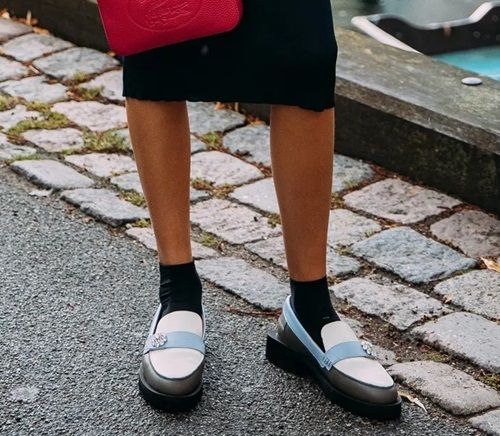 Tra i protagonisti del dettaglio anche i mocassini bicolore, ma questa volta abbinati a calzini neri. Ganni propone una versione bianco-nera, classica ma elegantissima e una variante a tre colori: nero, bianco e azzurro.