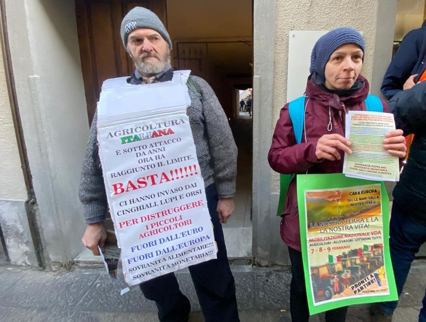 La 'protesta dei trattori' ha raggiunto la Valle d'Aosta e lo ha fatto nella kermesse regionale più nota e importante di tutte. Tra la folla della Fiera di Sant'Orso, tre attivisti del 'CRA Comitato per mobilitazione nazionale' indossando cartelloni-sandwich hanno difffuso volantini dal titolo 'Cara Europa, giù le mani dalla nostra terra. La nostra terra è la nostra vita', annunciando la mobilitazione di agricoltori, allevatori e cittadini dal 7 al 9 febbraio in Valle d'Aosta.