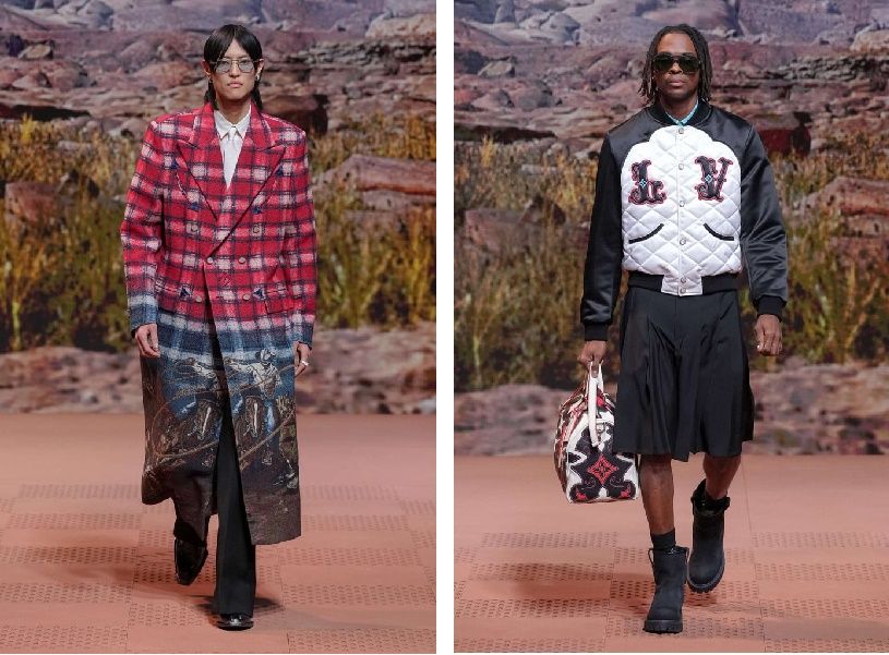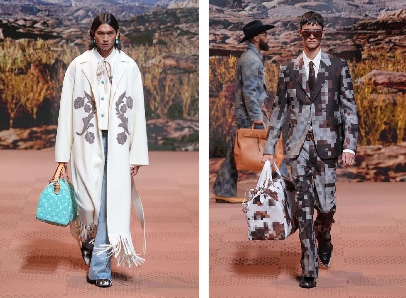 Per Louis Vitton è il gran ritorno dell’indimenticabile Far west. Cappotto lungo bianco con frange e gilet con bottoni in pietra turchese che riprendono i colori del borsone sono l’outfit dell’uomo selvaggio che LV propone per il prossimo inverno. Un cowboy forte e sicuro di sé che, ad un certo punto, diventa “pixellato” nel completo grigio, marrone e nero (borsone incluso).
