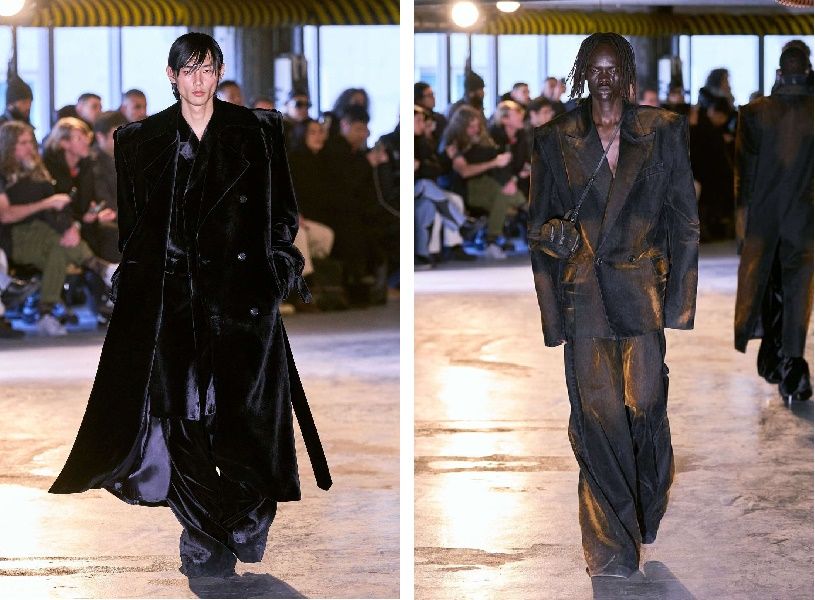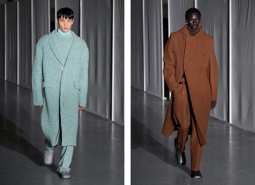 Lunghi cappotti, maglioni a collo alto e pantaloni in verde tenue – rigorosamente ton sur ton -   sono realizzati in lana a coste larghe per risultare caldi e morbidi, come “silhouette che scompaiono nella nebbia” definite così da lui stesso.