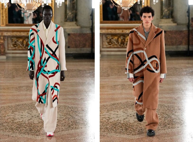 Il cappotto corto di derivazione militare in lana riconoscibile per i bottoni brandeburghesi con chiusure in pelle e bottoni a legnetto, in corno o legno, ritorna in una versione ultra creativa e ultra colorata. È celeste quello proposto dalla maison italiana con abbottonatura asimmetrica e lunghi lacci in corda ben visibili. Stesso taglio, ma nero con ricami in rilievo ad effetto 3D è la versione più elegante proposta per la sera o occasioni da non perdere.