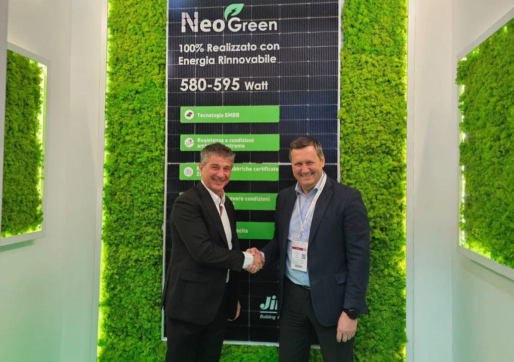 Oggi giovedì 29 febbraio, al Key- The Energy Transition Expo di Rimini, CVA Eos e Jinko Solar hanno firmato l’accordo commerciale che consentirà la costruzione in Italia del primo parco fotovoltaico, realizzato interamente con pannelli NeoGreen prodotti al 100% con energia rinnovabile. CVA Eos è la società del Gruppo CVA – Compagnia valdostana delle Acque SpA- che si occupa della generazione energetica eolica e fotovoltaica ma anche della gestione e dello sviluppo e dei relativi parchi.