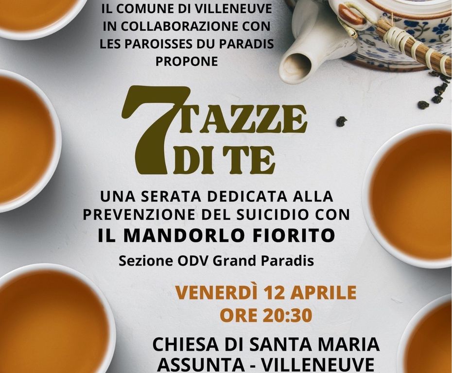 Venerdì 12 aprile alle ore 20,30 la chiesa di Santa Maria Assunta di Villeneuve ospiterà '7 tazze di tè', una serata per affrontare il tema della prevenzione del suicidio con i Volontari del soccorso Grand Paradis Il Mandorlo Fiorito.