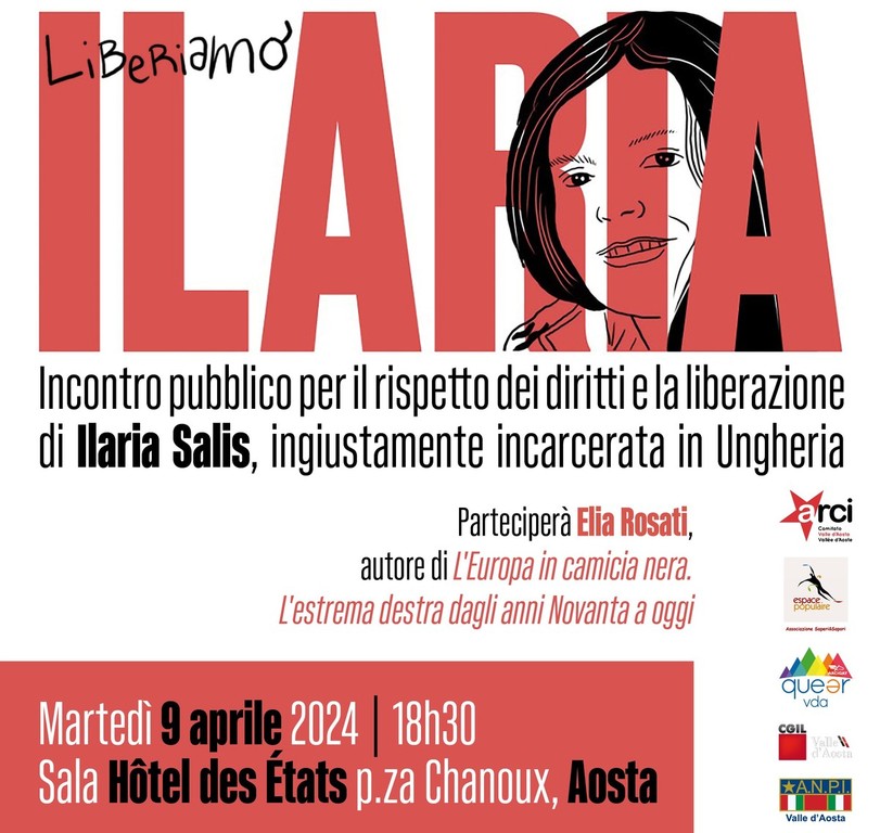 Martedì 9 aprile alle 18,30, nella sala Hôtel des États del municipio di Aosta, ARCI VdA/ Espace Populaire, CGIL VdA, ANPI VdA e Arcigay Queer VdA organizzano un incontro pubblico a sostegno del riconoscimento del diritto ad un giusto processo e ad un regime di detenzione dignitoso per Ilaria Salis, attualmente incarcerata in Ungheria.