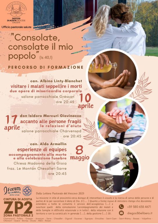 'Consolate, consolate il mio popolo': è all'insegna di questo passaggio biblico che l'Ufficio di pastorale della salute della Diocesi di Aosta, diretto da don Isidoro Mercuri Giovinazzo, ha organizzato con il vicario di Zona, don Diego Cuaz, tre appuntamenti formativi per mercoledì 10 aprile, mercoledì 17 aprile e venerdì 8 maggio.