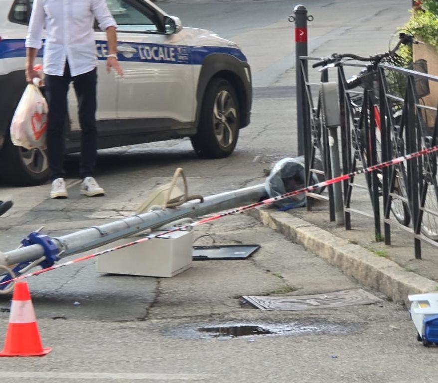 E' caduto d'un botto verso le 18,30 di oggi lunedì 1 luglio tra via Torino e via Vevey; il fato benevolo ha voluto che pur se in pieno giorno e in una zona trafficata di pedoni non finisse addosso a nessuno, anche se lo spavento dei passanti si è udito eccome. Ora Polizia locale e operai comunali stanno rimuovendo il pesante palo che sostiene le videocamere Ztl di quell'incrocio.