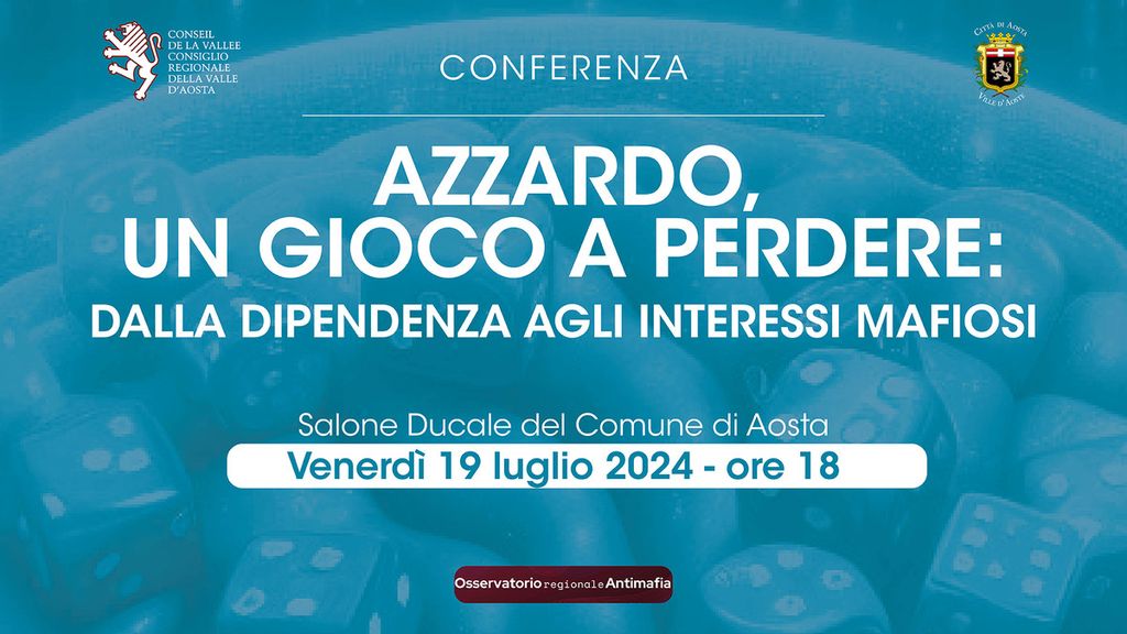Nell'ambito delle attività di informazione dell'Osservatorio regionale permanente sulla legalità e sulla criminalità organizzata e di tipo mafioso istituito dal Consiglio Valle, venerdì 19 luglio alle ore 18, nel Salone Ducale del Comune di Aosta, si terrà l'incontro pubblico 'Azzardo, un gioco a perdere: dalla dipendenza agli interessi mafiosi'.