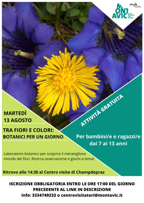 Martedì 13 agosto dalle ore 14,30 saranno i fiori coloratissimi del Parco Naturale Mont Avic i protagonisti del laboratorio dal titolo “Tra fiori e colori, botanico per un giorno” rivolto a bambini e ragazzi dai 7 ai 13 anni. Si svolgerà al Centro visitatori di Covarey (Champdepraz) e sarà un vero e proprio laboratorio botanico per scoprire il meraviglioso mondo dei fiori del Parco attraverso l’osservazione diretta e giochi a tema con l’aiuto e la guida di un guardaparco.
