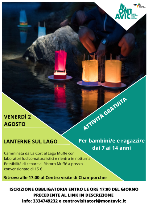 Venerdì 2 agosto i bambini e ragazzi dai 7 ai 14 anni sono invitati a partecipare all’iniziativa 'Lanterne sul lago'. Ritrovo al Centro visitatori di Champorcher in località Château alle ore 17. Si tratta di una suggestiva camminata da località Cort al lago Muffé (1 ora circa) con laboratori ludico-naturalistici. Si creeranno insieme le lanterne con materiale fornito dall’organizzazione. Possibilità di cenare al bar ristoro a un prezzo convenzionato di 15 euro, oppure cena al sacco a carico dei partecipanti. Rientro in notturna.
