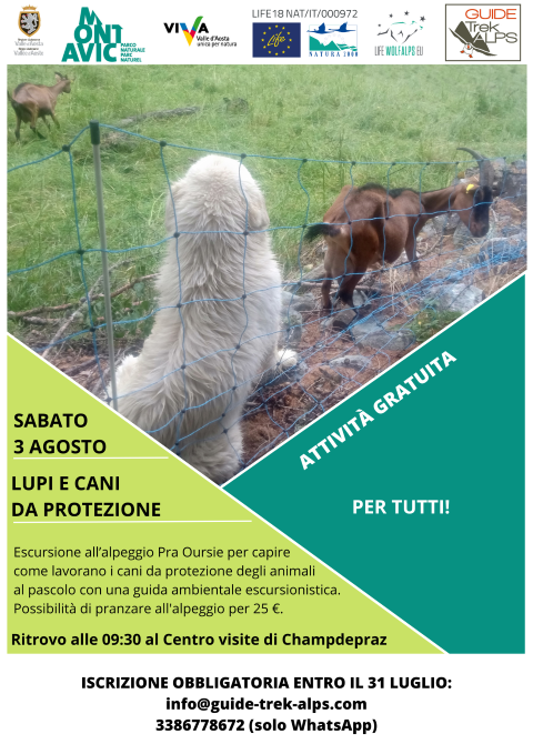 Sabato 3 agosto si parlerà di lupi e cani da protezione durante un’escursione all’alpeggio di Pra Oursie per capire come lavorano i cani da protezione degli animali al pascolo con una guida ambientale escursionistica. Si tratta di un’attività gratuita adatta a tutti, pranzo al sacco a carico dei partecipanti o possibilità di pranzare all'alpeggio al costo di 25 euro. Per informazioni è possibile scrivere un’email a info@guide-trek-alps.com o mandare un messaggio al numero 338-6778672.