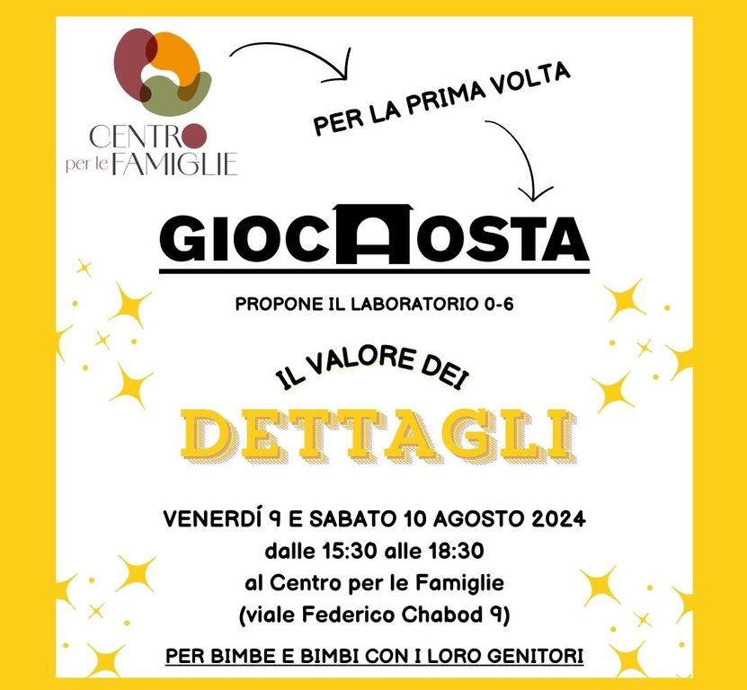 La prossima settimana, in occasione della XVI edizione di Giocaosta, il Centro per le famiglie per la prima volta partecipa al più grande evento di gioco della Valle d’Aosta. venerdì 9 e sabato 10 agosto dalle 15,30 alle 18,30, in via Federico Chabod 9, sarà infatti possibile prendere parte al laboratorio 'Il valore dei dettagli' destinato alla fascia 0-6 anni e ai loro genitori. E’ dalle piccole esperienze, dal contatto con la natura e i suoi materiali, dalla manipolazione di oggetti poco strutturati che i bambini apprendono e socializzano in un contesto di divertimento e solidarietà, scoprendo insieme il valore del gioco. Per partecipare non è necessaria la prenotazione.