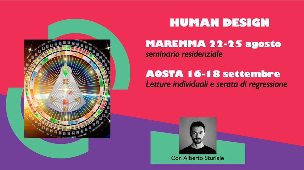 Dal 16 al 18 settembre ritorna ad Aosta Alberto Sturiale presso lo studio di Beatrice Raso in Regione Borgnalle 10, per proporre letture individuali di Human Design ('di base, 'sull'ombra', 'dei cicli', 'della croce di incarnazione', 'di coppia'), sessioni di counseling (su temi personali come relazione, lavoro, difficoltà di vario genere e approfondimenti dei concetti espressi durante le letture) e regressioni individuali.
