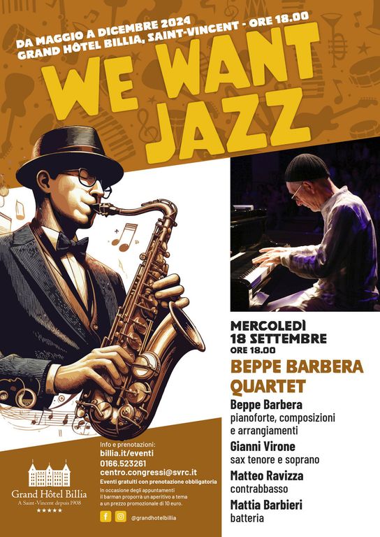 Continua con successo la rassegna 'We Want Jazz' al Grand Hôtel Billia di Saint-Vincent, dove alcuni tra gli artisti più interessanti nel panorama jazzistico valdostano, italiano ed estero hanno dato il via nel mese di maggio a una serie di concerti gratuiti di alto livello.