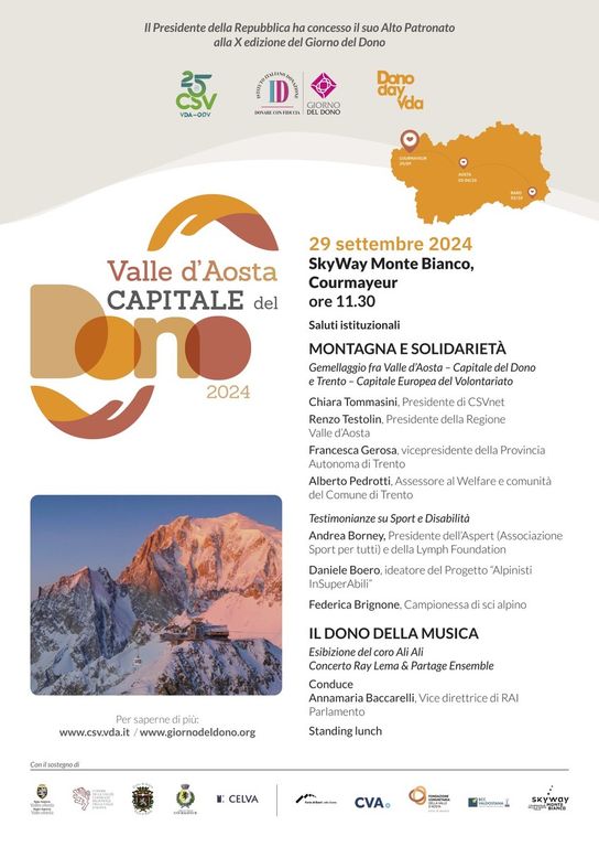 Il Presidente della Repubblica ha concesso il suo Alto Patronato alla decima edizione del Giorno del Dono. Gli eventi di Valle d’Aosta Capitale del Dono 2024 hanno ricevuto il sostegno da parte della Regione autonoma Valle d’Aosta, del Consiglio Regionale della Valle d’Aosta, dei Comuni di Aosta e Courmayeur e del CELVA, oltre al supporto di BCC Valdostana, CVA, Skyway Monte Bianco, Forte di Bard, Area Megalitica di Saint-Martin-de-Corléans e Fondazione Comunitaria della Valle d’Aosta, oltre al supporto di numerosi partner nazionali.