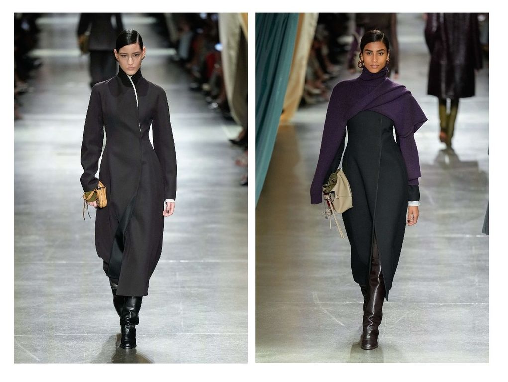 Contrasto nei colori e nei tessuti è la collezione di Hermès. Seta e lana insieme in una contrapposizione di cromie che vanno dal senape al blu, dal nero al cammello, dal rosso mattone al bianco neve. La Maison francese non lascia spazio al romanticismo e disegna una femme decisa che sa cosa vuole dalla vita.