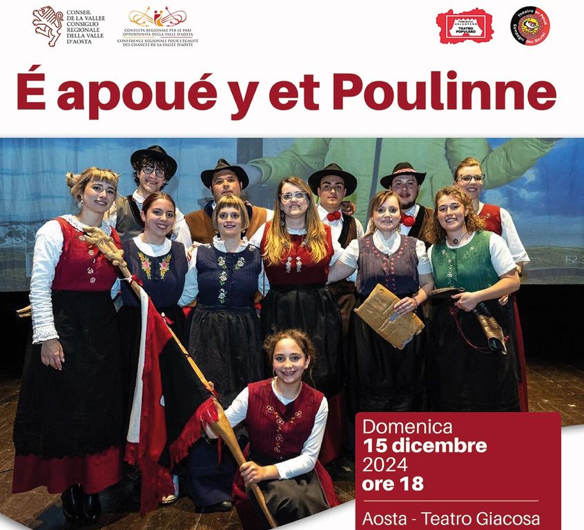 Domenica 15 dicembre 2024, alle ore 18, il Teatro Giacosa di Aosta ospiterà la pièce teatrale 'É apoué y et Poulinne', messa in scena dalla Compagnì dou Beufet di Arnad. L’evento, a ingresso libero, è organizzato dalla Consulta regionale per le pari opportunità; affronta il tema della violenza sulle donne attraverso la lente del teatro popolare, grazie a una compagnia di grande tradizione, composta interamente da attori under 40.