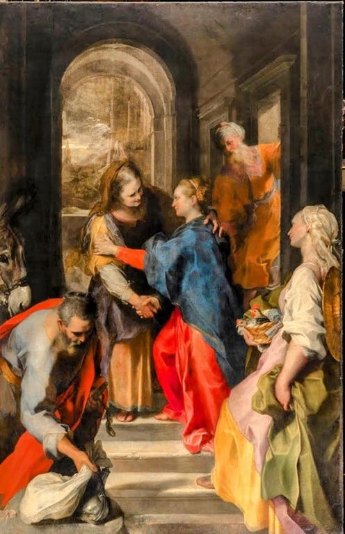 Come opera vi propongo la Visitazione (1583-1586) realizzata dall’urbinate Federico Barocci (1535-1612). L’inconsueta scelta dell’artista di restare nella sua città natale, pur avendo conosciuto i centri maggiori dell’arte italiana, e in particolare Roma, non gli impedì di diventare un punto di riferimento importante per gli artisti del tempo tanto da essere considerato uno tra i più grandi maestri del ‘500 capace di influenzare la scena artistica europea. Lo si può collocare a metà strada tra Raffaello e Caravaggio in quanto continuatore del Rinascimento e allo stesso tempo antesignano del Barocco. La tela in questione fu commissionata da san Filippo Neri per la chiesa di Santa Maria in Vallicella a Roma, dove ancora oggi la si può contemplare. Testimonianze antiche rivelano che il Santo amava spesso sostarvi in preghiera. Del dipinto vi è una copia realizzata dal Barocci presso la Galleria Nazionale delle Marche. Elisabetta che era più anziana di Maria, accoglie la cugina sulle scale, le mani si stringono, gli sguardi si incontrano. Un particolare che desidero evidenziare è il sorriso che si intravede dal volto di Elisabetta e anche da quello della Madonna. L’incontro con Maria, il rivolgerci a lei quotidianamente con la preghiera genera in noi quella gioia che nasce dal percepire che attraverso di lei siamo visitati da Dio che ci viene a trovare in casa per farsi vicino a ciò che stiamo vivendo. E’ una certezza, che ci viene ricordata nel quadro da Zaccaria che si affaccia sulla soglia per vedere cosa sta succedendo ed è la nostra libertà di aprire o meno la porta al Signore che ci viene incontro in tanti modi anche attraverso sua Madre.