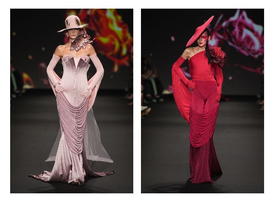 Poi arrivano l’ironia e la simpatia di Robert Wun che, in un gioco di colori e sovrapposizioni di tessuti, reinterpreta l’eleganza per il capodanno. Bustier intrecciati, gonne plissettate, lunghi guanti e cappelli ton sur ton sono il look giusto per aspettare e festeggiare l’arrivo del nuovo anno. Le palette del rosa e rosso non sono state scelte a caso dallo stilista londinese nato ad Hong Kong; entrambe sono simbolo di femminilità e di buon auspicio per l’anno del Serpente che, per l’oroscopo cinese, abbraccia nuove opportunità, mantiene equilibrio e speranza di realizzare sogni e progetti.
