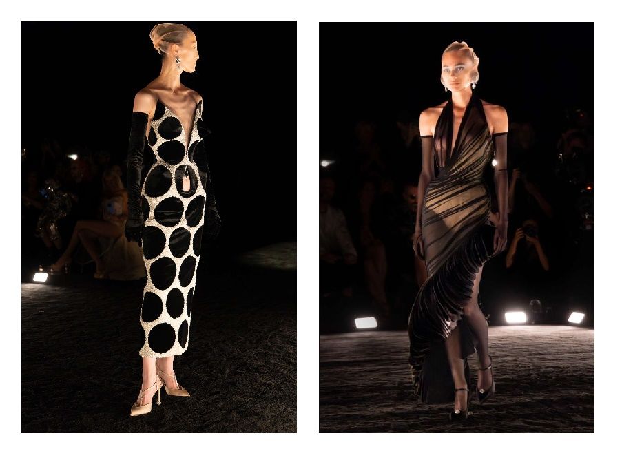 Il nero velato e romantico, ricamato da raffinati drappeggi avvolgono la donna creando un effetto glamour irresistibile agli occhi di chiunque. Il gusto ricercato delle linee dei suoi capi, i bustier ondeggianti e décoltées a tacco altissimo con gioiello sono gli ingredienti giusti per una serata speciale in attesa del nuovo anno.