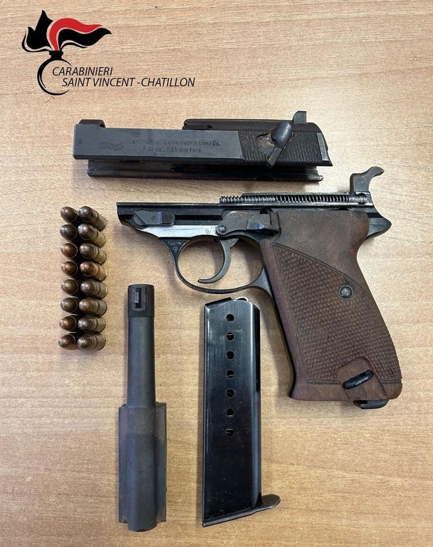 A Châtillon, i militari hanno fermato un 24enne italiano residente nel paese della media Valle, trovato in possesso di 60 grammi di cocaina e di una pistola automatica Walther calibro 7,65 con la matricola abrasa e 16 proiettili di identico calibro (foto sotto); sul caso sono in corso, in stretto riserbo, approfondite indagini per risalire alla provenienza dell’arma.