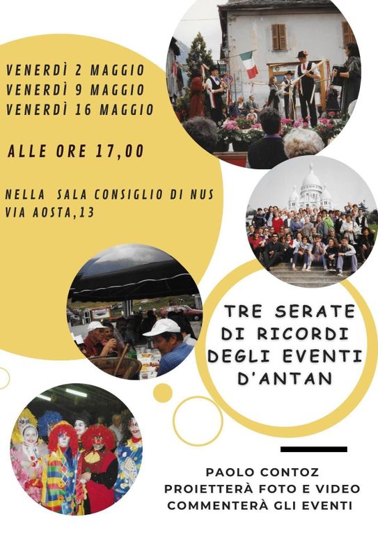 Si tratta di tre momenti conviviali durante i quali l'ex consigliere regionale Uv, che per diversi anni fu presidente della locale Proloco ripercorrerà e commenterà, con l'aiuto di fotografie e di video, alcune manifestazioni di successo svoltesi nel paese della media Valle.