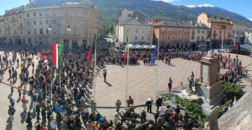Dal giardino della Rimemberanza, entrando in piazza accolta da qualche migliaio di persone, la Banda musicale di Aosta ha suonato 'Bella Ciao'.