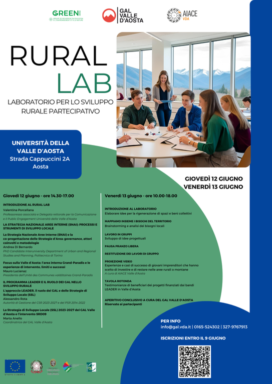 Le iscrizioni al “Rural Lab” sono aperte fino al 9 giugno 2025, compilando il form disponibile al link https://forms.gle/9R1dGQqcHVvQPn7E7. Per maggiori informazioni: info@gal.vda.it - 0165524302