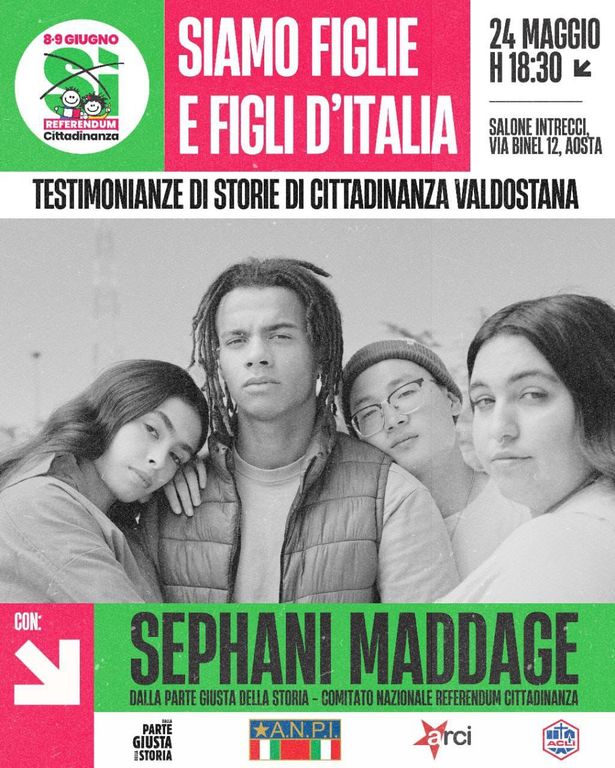 Per discuterne insieme alla cittadinanza, sabato 24 maggio alle ore 18,30 nel salone del ristorante Intrecci in via Binel 12 ad Aosta, si terrà un incontro pubblico promosso da Arci VdA, Acli VdA e Anpi VdA e moderato da Chiara Isabelle Berard. Ospite speciale dell’incontro sarà Sephani Maddage, attivista e portavoce del comitato nazionale 'Dalla Parte Giusta della Storia', promotore del referendum.