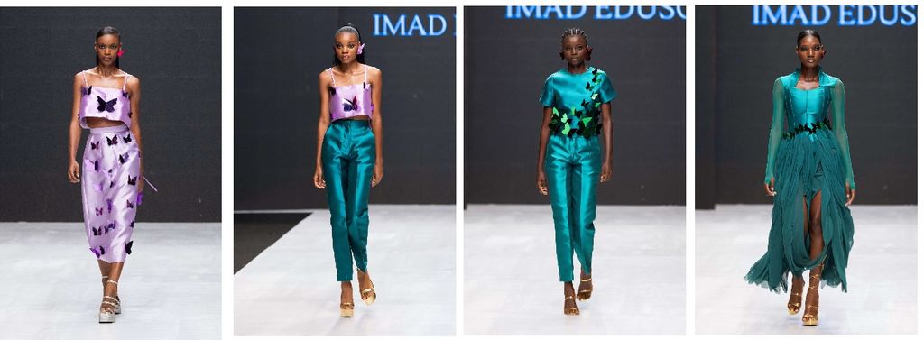 Per Imas Eduso, lilla e verde luminoso sono i colori perfetti per le stagioni più calde dell’anno. Tonalità vitaminiche che hanno regnato su tutte le passerelle e che la stilista ha voluto declinare sia in corto che in lungo. Su tutte le silhouette prendono il volo leggere farfalle che raccontano l’attenzione verso la natura e ai suoi simboli. Un look 3D per non passare inosservati.