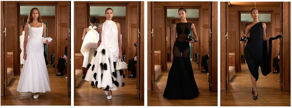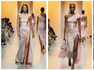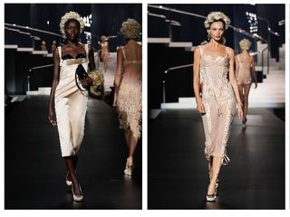 Dolce & Gabbana scelgono il color champagne per esprimere la sensualità, il fascino e il carattere della donna moderna. Per i due stilisti italiani, le proposte 2025 sono il risultato di un continuo dialogo tra passato e presente. La femminilità viene raccontata attraverso linee precise che ne esaltano la silhouette. Vestiti tagliati e cuciti su misura e dettagli di corsetteria esprimono una donna forte e consapevole. Reggiseni a cono, lacci, gancetti e stringhe sono l’emblema della seduzione tutta mediterranea.