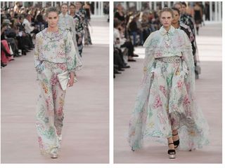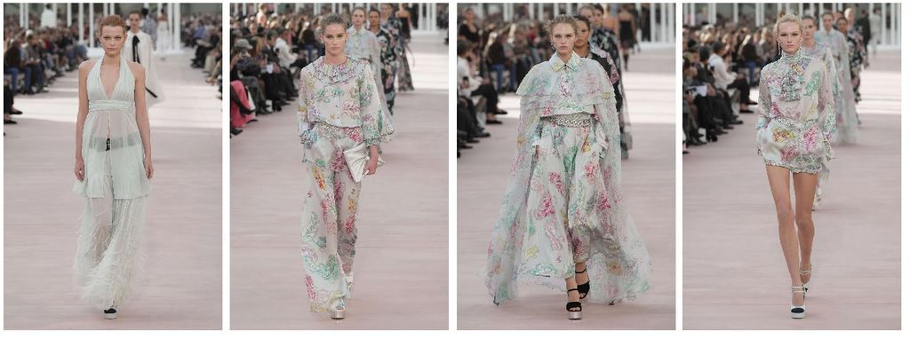 La collezione estiva di Chanel è un inno alla leggerezza, alla delicatezza e al movimento. I tessuti morbidi accarezzano le silhouette femminili, si adagiano sui loro corpi e scendono gentilmente creando un effetto “piuma” grazie alla consistenza impalpabile della pregiata seta e di velature super trasparenti.