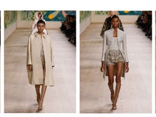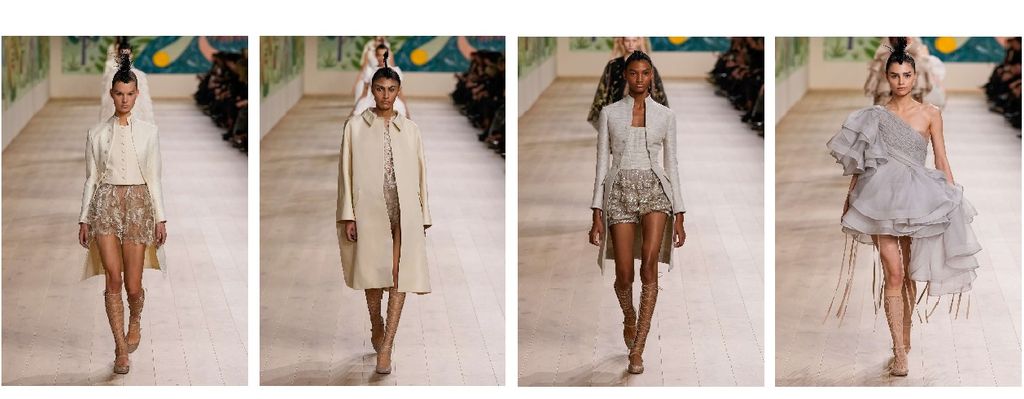 Bianco panna e grigio argento sono i colori scelti da Christian Dior per un’estate elegante all’insegna della leggerezza e raffinatezza. Gambe scoperte, trasparenze e tessuti pregiati sono il mix giusto per le giornate importanti. Quasi un ritorno al passato nei tagli di giacche e corpetti che ricordano i grandi balli dell’Ottocento.
