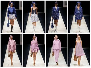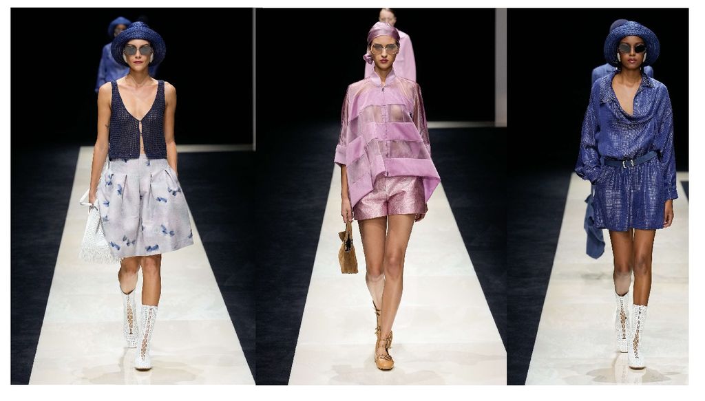 Armani sceglie il blu e il lilla, in versione sgargiante per un’eleganza tutta italiana. Raso, seta, cotone e lino sono i tessuti che lo stilista privilegia per una donna raffinata, ma sempre a suo agio. Linee semplici e simmetriche, veli leggeri e morbidi, casacche trasparenti che cadono dolcemente. Un modo di vestire contemporaneo che si costruisce dal passato e guardare al futuro.