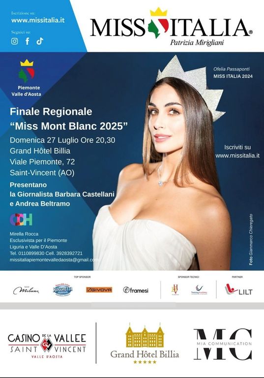 Domenica 27 luglio alle 20,30, nella sala Gran Paradiso, si terrà la finale regionale di Miss Mont Blanc 2025. Le finaliste sfileranno in un contesto elegante, tra shooting fotografici e ospiti del mondo dello spettacolo. In giuria, oltre a Filippo Roma, anche il chirurgo plastico Massimo Di Giuli e la modella Giulia Bizzotto, con la partecipazione di rappresentanti di LILT e Codacons.