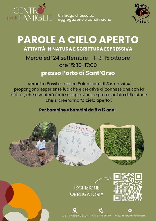 Parallelamente, prenderà il via il progetto Parole a cielo aperto, un ciclo di incontri di scrittura espressiva e attività in natura pensato per bambini e bambine tra gli 8 e i 12 anni. Condotti da Veronica Bossi e Jessica Baldassarri di Forme Vitali, gli appuntamenti si svolgeranno all’Orto Sant’Orso ogni mercoledì dal 24 settembre al 15 ottobre, con l’obiettivo di stimolare la creatività attraverso il contatto diretto con l’ambiente naturale.