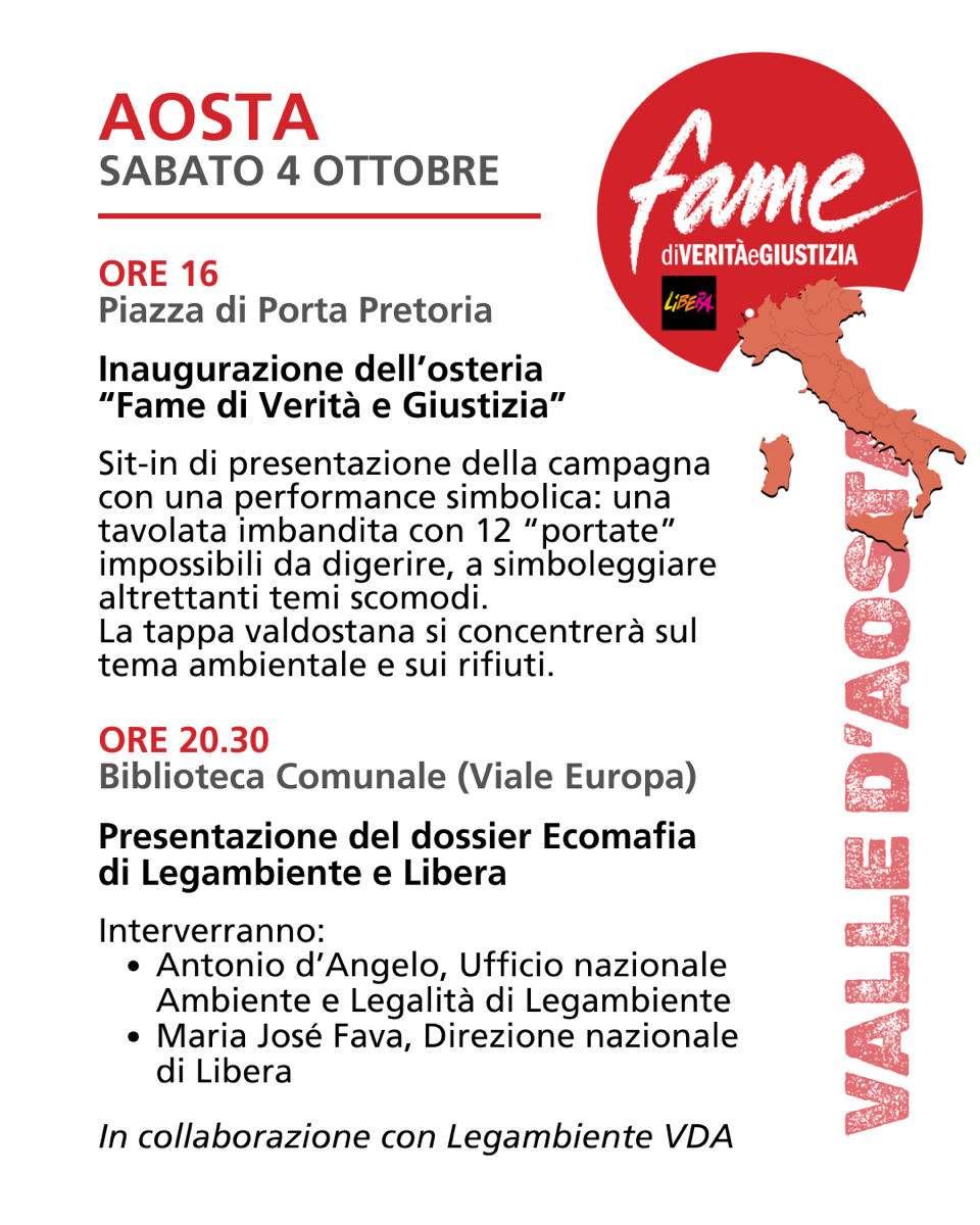 La tappa valdostana è in programma sabato 4 ottobre ad Aosta. Alle ore 16, in Piazza Porta Praetoria, sarà allestita un’“Osteria in piazza” con un menù di dodici “portate difficili da digerire”: metafora delle principali emergenze criminali e sociali. Tra queste, i reati ambientali, che costituiranno il tema centrale dell’appuntamento locale grazie alla collaborazione con Legambiente Valle d’Aosta.
