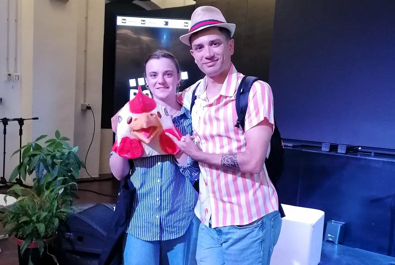 Sul palco Fabien Lucianaz (nella foto sopra insieme a Chryslène, voce) è stato accompagnato da Chryslène Quendoz nelle vesti de Lo Pou, la mascotte della compagnia al suo debutto fuori porta. "Un’altra bella esperienza – conclude Fabien Lucianaz -, che ci ha permesso di portare il nostro dialetto franco-provenzale valdostano (patois) ancora una volta fuori Valle d’Aosta e di poter conoscere altri artisti e operatori del settore".