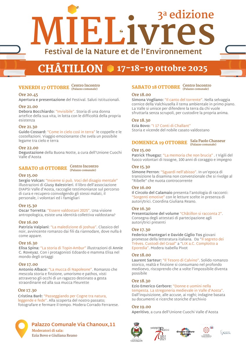 Dal 17 al 19 ottobre 2025 Châtillon ospiterà la terza edizione di 'Mielivres – Festival de la Nature et de l’Environnement', appuntamento che negli anni si è consolidato come punto di riferimento per chi ama la natura, l’apicoltura e la sostenibilità.