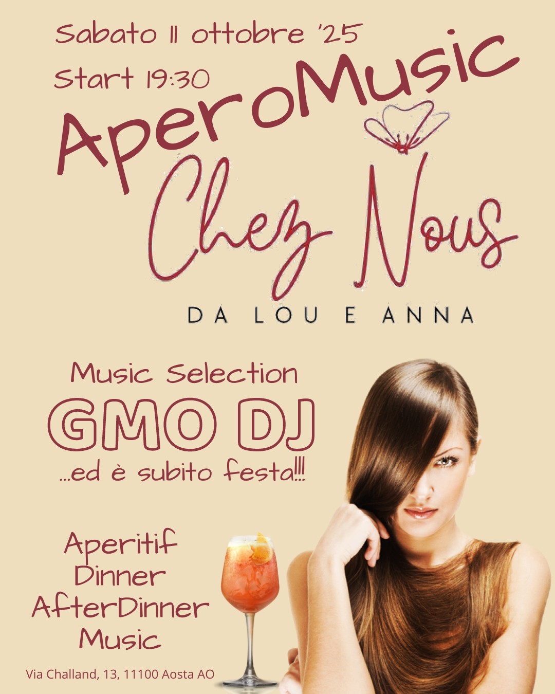 Sabato 11 ottobre, a partire dalle 19.30, Lou e Anna propongono una serata speciale all’insegna della convivialità e della musica. L’occasione sarà perfetta per brindare insieme e lasciarsi coinvolgere dal ritmo della music selection di GMO Dj, che accompagnerà la serata con un mix di sonorità eleganti e coinvolgenti. Tra amici, sorrisi e buona musica, il Café Chez Nous promette un appuntamento da non perdere per scoprire o riscoprire un angolo di Aosta che profuma di casa.