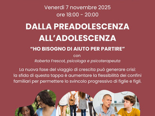 Mercoledì 22 ottobre torna l’Aperimamma, mentre venerdì 7 novembre la psicologa Roberta Frescot guiderà l’incontro della Cassetta degli attrezzi per genitori im-perfetti, dedicato ai nuovi equilibri familiari nell’adolescenza. Da lunedì 3 novembre riparte anche il progetto Famiglia Più Famiglia, con quattro incontri sull’affido e l’accoglienza.